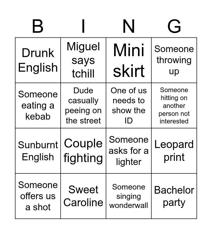 This bingo card has 16 words: Sweet Caroline, Leopard print, Mini skirt, Drunk English, Sunburnt English, Miguel says tchill, Someone asks for a lighter, Someone singing wonderwall, Someone eating a kebab, Dude casually peeing on the street, Someone offers us a shot, Someone throwing up, Couple fighting, Someone hitting on another person not interested, One of us needs to show the ID and Bachelor party.