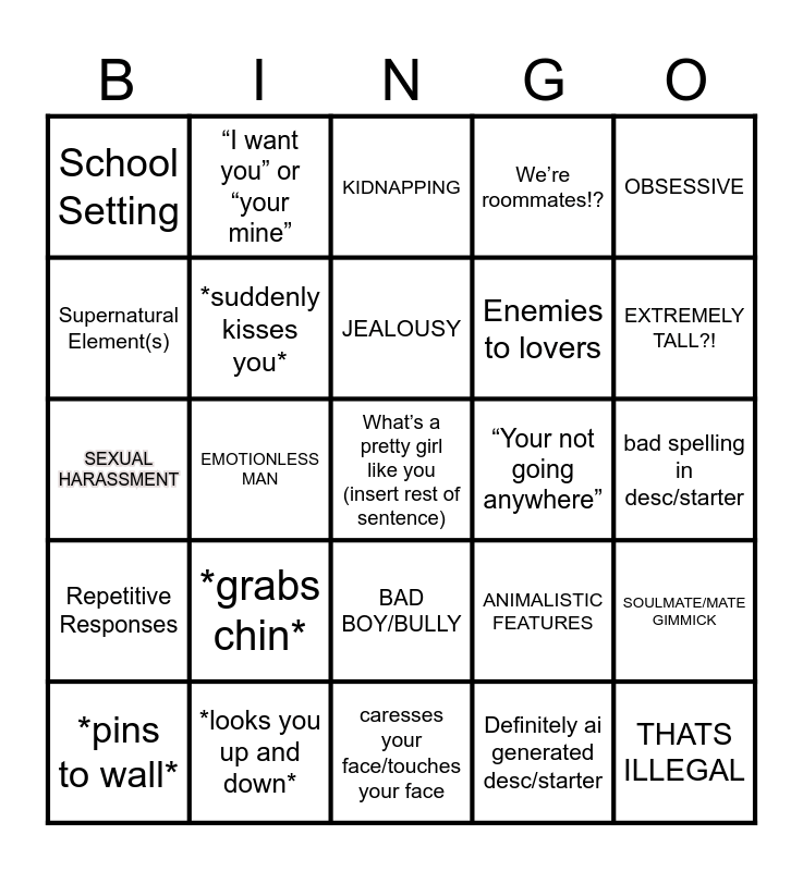 This bingo card has a free space and 24 words: *grabs chin*, *looks you up and down*, JEALOUSY, *pins to wall*, OBSESSIVE, School Setting, Supernatural Element(s), “I want you” or “your mine”, “Your not going anywhere”, BAD BOY/BULLY, Enemies to lovers, SEXUAL HARASSMENT, ANIMALISTIC FEATURES, SOULMATE/MATE GIMMICK, *suddenly kisses you*, Definitely ai generated desc/starter, bad spelling in desc/starter, KIDNAPPING, EXTREMELY TALL?!, EMOTIONLESS MAN, THATS ILLEGAL, Repetitive Responses, We’re roommates!? and caresses your face/touches your face.