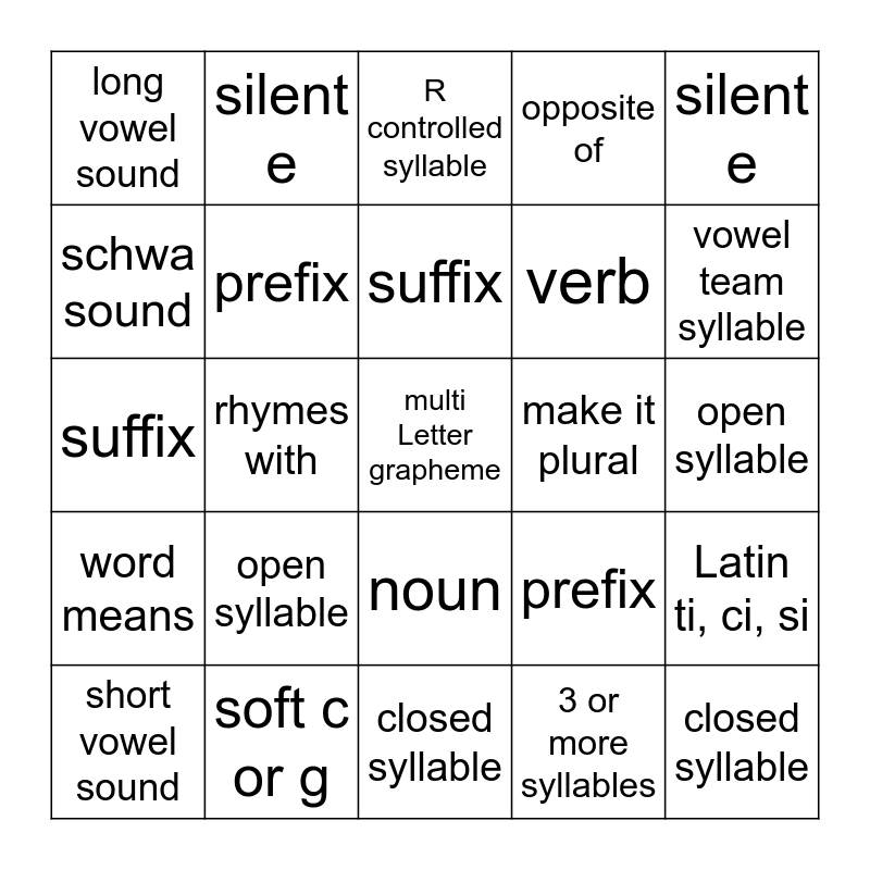 This bingo card has 25 words: open syllable, closed syllable, suffix, short vowel sound, silent e, long vowel sound, schwa sound, silent e, make it plural, noun, verb, suffix, prefix, Latin ti, ci, si, prefix, closed syllable, open syllable, R controlled syllable, vowel team syllable, rhymes with, multi Letter grapheme, soft c or g, word means, opposite of and 3 or more syllables.