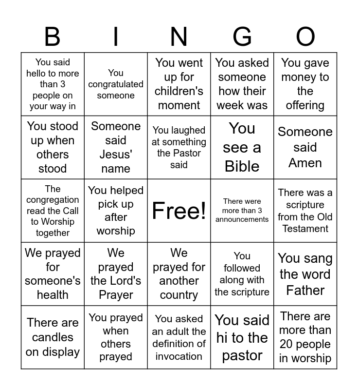 This bingo card has a free space and 29 words: There are candles on display, You sang the word Spirit, You helped pick up after worship, You heard the word Potter, You said hello to more than 3 people on your way in, You went up for children's moment, Someone said Jesus' name, We prayed the Lord's Prayer, There were more than 3 announcements, You prayed when others prayed, There was a scripture from the Old Testament, There are more than 20 people in worship, You asked an adult the definition of invocation, You said hi to the pastor, Someone said Amen, You saw the full cross at the front of the church, We prayed for another country, We prayed for someone's health, You gave money to the offering, The congregation read the Call to Worship together, You followed along with the scripture, Someone sneezed during the service, You see a Bible, You stood up when others stood, You asked someone how their week was, You congratulated someone, You sang the word Father, You laughed at something the Pastor said and You drew something on the back of this page.