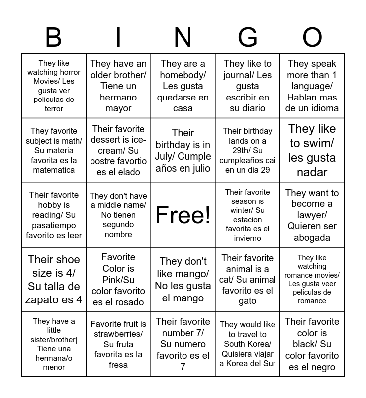 This bingo card has a free space and 24 words: Favorite Color is Pink/Su color favorito es el rosado, Favorite fruit is strawberries/ Su fruta favorita es la fresa, Their birthday is in July/ Cumple años en julio, They have a little sister/brother| Tiene una hermana/o menor, They speak more than 1 language/ Hablan mas de un idioma, They like watching horror Movies/ Les gusta ver peliculas de terror, They favorite subject is math/ Su materia favorita es la matematica, They have an older brother/ Tiene un hermano mayor, Their favorite season is winter/ Su estacion favorita es el invierno, They don't like mango/ No les gusta el mango, Their birthday lands on a 29th/ Su cumpleaños cai en un dia 29, Their favorite hobby is reading/ Su pasatiempo favorito es leer, Their favorite animal is a cat/ Su animal favorito es el gato, They like watching romance movies/ Les gusta veer peliculas de romance, Their favorite dessert is ice-cream/ Su postre favortio es el elado, They would like to travel to South Korea/ Quisiera viajar a Korea del Sur, They want to become a lawyer/ Quieren ser abogada, They are a homebody/ Les gusta quedarse en casa, They like to swim/ les gusta nadar, They don't have a middle name/ No tienen segundo nombre, Their favorite color is black/ Su color favorito es el negro, Their shoe size is 4/ Su talla de zapato es 4, They like to journal/ Les gusta escribir en su diario and Their favorite number 7/ Su numero favorito es el 7.