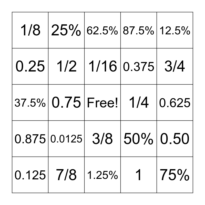 This bingo card has a free space and 25 words: 0.0125, 1.25%, 1/16, 0.125, 12.5%, 1/8, 0.25, 25%, 1/4, 3/8, 0.375, 37.5%, 50%, 0.50, 1/2, 5/8, 0.625, 62.5%, 3/4, 0.75, 75%, 7/8, 0.875, 87.5% and 1.