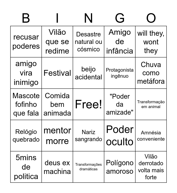 This bingo card has a free space and 24 words: mentor morre, deus ex machina, beijo acidental, 5mins de politica, will they, wont they, recusar poderes, amigo vira inimigo, Vilão que se redime, "Poder da amizade", Nariz sangrando, Protagonista ingênuo, Mascote fofinho que fala, Poder oculto, Amnésia conveniente, Festival, Polígono amoroso, Transformação em animal, Desastre natural ou cósmico, Chuva como metáfora, Comida bem animada, Vilão derrotado volta mais forte, Relógio quebrado, Amigo de infância and Transformações dramáticas.