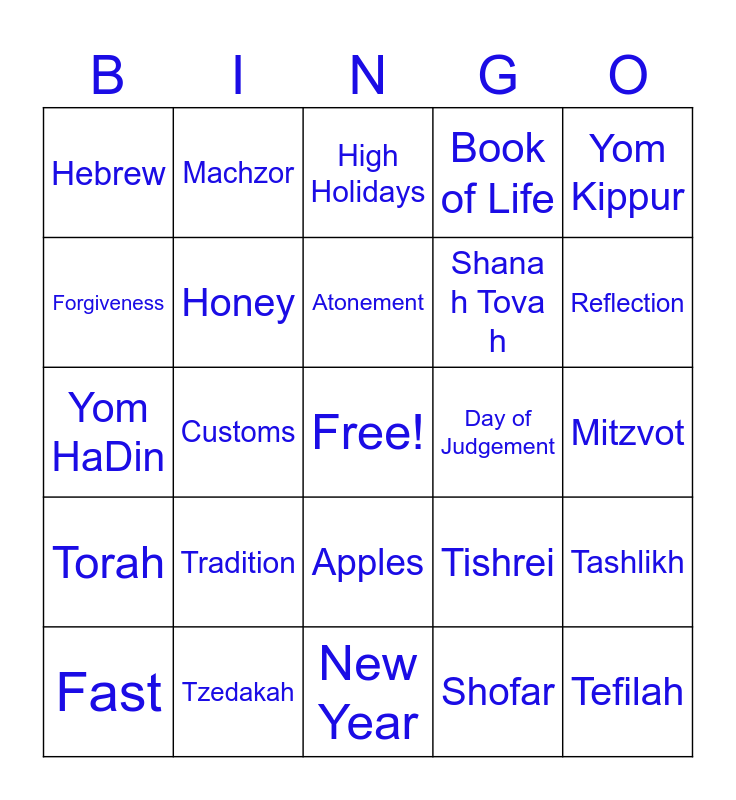 This bingo card has a free space and 30 words: Tzedakah, Beginnings, Customs, Rosh Hashanah, Hebrew, High Holidays, Honey, Apples, Day of Judgement, New Year, Mitzvot, Tefilah, Shofar, Kol Nidre, Reflection, Teshuvah, Tishrei, Torah, Tradition, Yom Kippur, Yom HaDin, Round Challah, Machzor, Shanah Tovah, Forgiveness, Book of Life, Tashlikh, Fast, Atonement and Jonah.