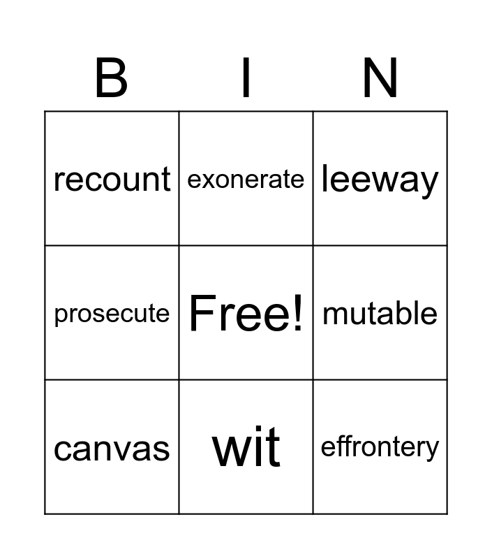 This bingo card has a free space and 8 words: mutable, leeway, exonerate, canvas, recount, effrontery, prosecute and wit.
