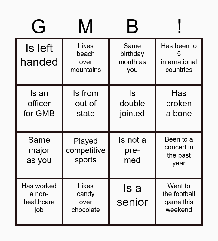 This bingo card has 16 words: Likes candy over chocolate, Been to a concert in the past year, Same birthday month as you, Is left handed, Same major as you, Likes beach over mountains, Is not a pre-med, Is a senior, Is an officer for GMB, Is from out of state, Has worked a non-healthcare job, Has been to 5 international countries, Played competitive sports, Has broken a bone, Is double jointed and Went to the football game this weekend.