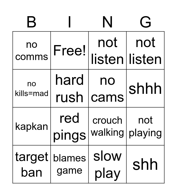 This bingo card has 19 words: crouch walking, talked over, not listen, shh, not playing, no kills=mad, slow play, no comms, Free!, kapkan, red pings, hard rush, no cams, blames game, target ban, bad common sense, not listen, shhh and no kills=mad.