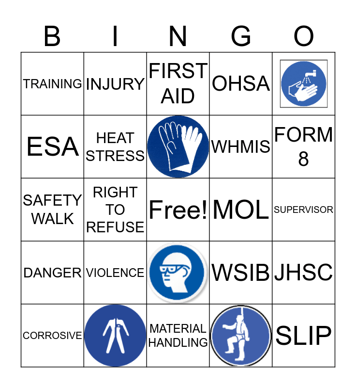 This bingo card has 5 images, a free space and 21 words: TRAINING, ESA, INJURY, SUPERVISOR, WSIB, WHMIS, SAFETY WALK, JHSC, CORROSIVE, RIGHT TO REFUSE, RIGHT TO KNOW, OHSA, DANGER, FIRST AID, SLIP, FORM 8, MATERIAL HANDLING, MOL, VIOLENCE, HEAT STRESS and FALL.