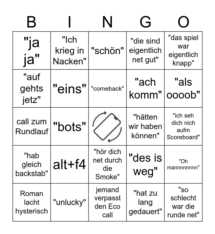 This bingo card has a free space and 60 words: "lass mich mal rampe allein", "unlucky", "timing", "hab gleich backstab", "hat zu lang gedauert", "ist auch der topfragger", "eins", "aua aua aua", "ach komm", börndi liest damage nummern vor, "die sind eigentlich net gut", "u-low", "auf gehts jetz", "nicht zu viel machen", "schade", "ja ja", "so schlecht war die runde net", "das spiel war eigentlich knapp", "waren auch smurfs glaub ich", "comeback", "hätten wir haben können", "schön", Roman lacht hysterisch, "Oh mannnnnnnn", "hello guys", "lass mich ace", "ich geh jetz nur noch auf stats", "jetz Tempowechsel", "als oooob", hohes schreien, "komm, eine noch", "Fokus", "Langsam", "Ruhe jetz!!1!", "Ich krieg in Nacken", "pistol round is immer weg", "rein da jetz", "bots", fast heulen vor Frust, call zum Rundlauf, "ja genauuuuu", alt+f4, "ich seh dich nich aufm Scoreboard", geklautes Ace, "des is weg", Börndi regt sich über Jonas auf, "(site) mit Hass", "ich mach mich weg", "zack", "hör dich net durch die Smoke", jemand verpasst den Eco call, wortlos disconnect nach dem Match, neigschaut (in einen bekannten enemy), zu viele Leute legen, "wo is eigentlich die Bombe?", Jannik spielt Revolver, Rentnerwaffe, Grail?, "die Map is sowieso (T/CT)-sided" and ⚡Zeus-Kill⚡.