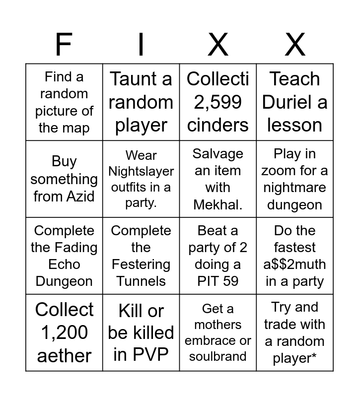 This bingo card has 16 words: Collect 1,200 aether, Kill or be killed in PVP, Collecti 2,599 cinders, Teach Duriel a lesson, Buy something from Azid, Taunt a random player, Beat a party of 2 doing a PIT 59, Do the fastest a$$2muth in a party, Find a random picture of the map, Wear Nightslayer outfits in a party., Get a mothers embrace or soulbrand, Play in zoom for a nightmare dungeon, Complete the Fading Echo Dungeon, Complete the Festering Tunnels, Salvage an item with Mekhal. and Try and trade with a random player*.
