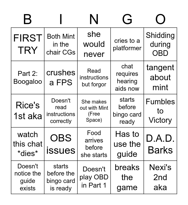 This bingo card has a free space and 24 words: Doesn't notice the guide exists, OBS issues, Read instructions but forgor, breaks the game, Shidding during OBD, FIRST TRY, Both Mint in the chair CGs, she would never, starts before bingo card ready, Fumbles to Victory, Rice's 1st aka, crushes a FPS, Has to use the guide, D.A.D. Barks, Part 2: Boogaloo, starts before the bingo card is ready, Doesn't play OBD in Part 1, cries to a platformer, tangent about mint, watch this chat *dies*, Doesn't read instructions correctly, Food arrives before she starts, chat requires hearing aids now and Nexi's 2nd aka.