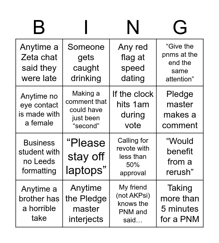 This bingo card has 20 words: “Would benefit from a rerush”, “Good social fit”, Any red flag at speed dating, Any time Cooper interjects, Anytime a brother has a horrible take, Anytime no eye contact is made with a female, Anytime the Pledge master interjects, Anytime a Zeta chat said they were late, Business student with no Leeds formatting, Someone gets caught drinking, “Please stay off laptops”, Calling for revote with less than 50% approval, Making a comment that could have just been “second”, Taking more than 5 minutes for a PNM, If the clock hits 1am during vote, PNM wrote short answers, Pledge master makes a comment, “Give the pnms at the end the same attention”, My friend (not AKPsi) knows the PNM and said… and “Please be quiet”.