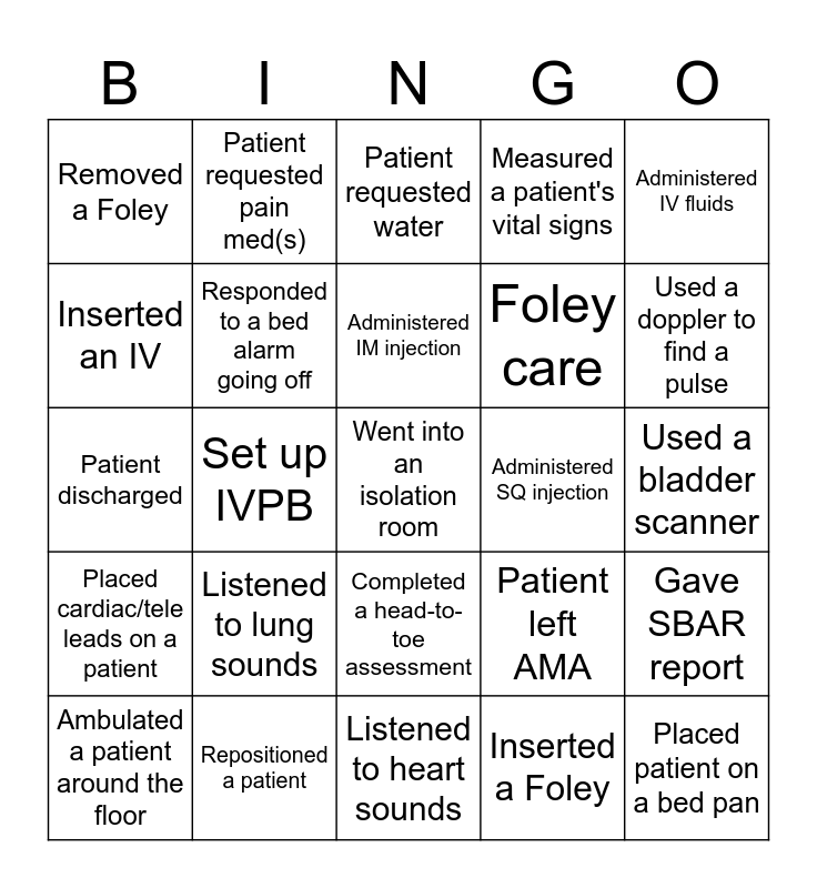 This bingo card has 49 words: Inserted an NG tube, Went into an isolation room, Code brown, Listened to heart sounds, Listened to lung sounds, Measured I&Os, Patient requested pain med(s), Patient refused med(s), Inserted an IV, Discontinued an IV, Responded to a bed alarm going off, Measured a patient's vital signs, Gave SBAR report, Patient left AMA, Administered IV medication, Administered PO medication, Administered IM injection, Administered SQ injection, Administered meds through an enteral tube, Administered IV fluids, Set up IVPB, Inserted a Foley, Removed a Foley, Foley care, Used the glucometer on a patient, Used a doppler to find a pulse, Ambulated a patient around the floor, Observed a surgical procedure, Completed a head-to-toe assessment, Placed cardiac/tele leads on a patient, Changed a wound dressing, Witnessed the birth of a child, Completed ostomy care, Code Blue/rapid response, Repositioned a patient, Took a manual BP, Gave bed bath, Answered a call light alone, Used a bladder scanner, Patient was A&O x1, Participated in rounds, Assisted a patient with feeding, Placed patient on a bed pan, New patient admission, Patient discharged, Patient requested water, Received a compliment from a patient, Thanked a staff member and Changed a central line dressing.