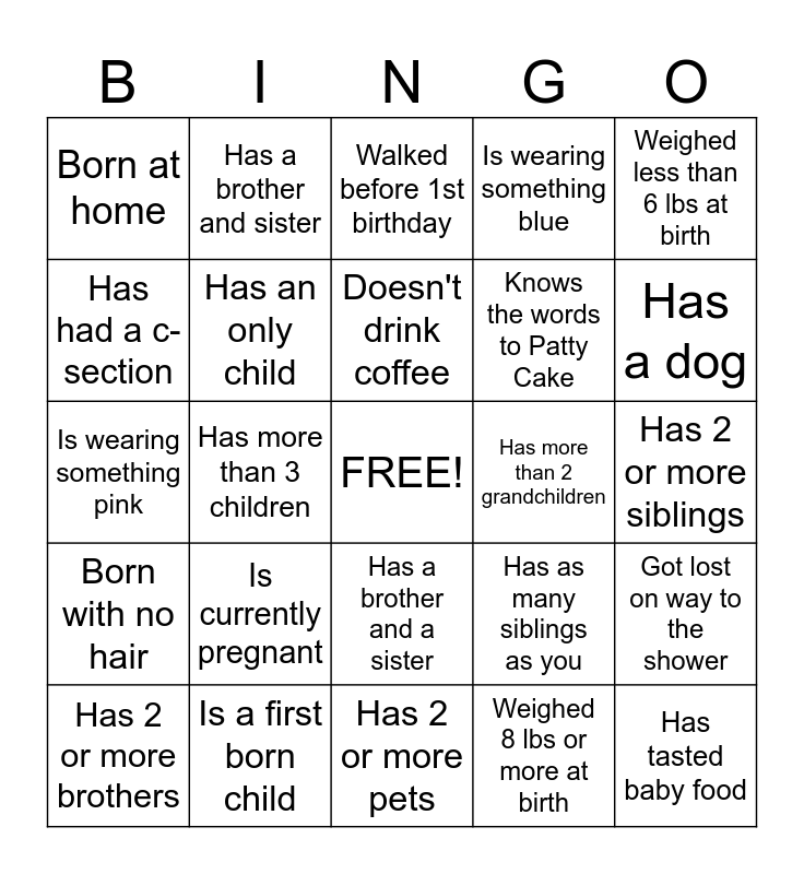 This bingo card has a free space and 40 words: Has never changed a diaper, Is wearing something pink, Labored less than 5 hours, Has an only child, Is a first born child, Has a brother and a sister, Doesn't drink coffee, Made their own baby food, Weighed less than 6 lbs at birth, Born with no hair, Has more than 3 children, Is wearing something blue, Has tasted baby food, Has 2 or more siblings, Has more than 2 grandchildren, Is currently pregnant, Is the youngest child, Born at home, Drives a minivan, Walked before 1st birthday, Got lost on way to the shower, Weighed 8 lbs or more at birth, Knows the words to Patty Cake, Has had a c-section, Has twins, Is currently pregnant, Was pregnant in the past year, Doesn’t drink coffee, Is a natural blonde, Is allergic to cats, Doesn’t eat meat, Has 2 or more brothers, Has your hair color, Has as many siblings as you, Has a dog, Has 2 or more pets, Has a tattoo, Owns a Disney movie on VHS, Has a brother and sister and Is the youngest child.