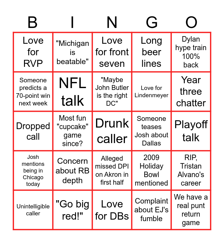 This bingo card has a free space and 42 words: Starters in too long, "Maybe John Butler is the right DC", Excited about Lateef, Concern about RB depth, Complaint about EJ's fumble, RIP, Tristan Alvano's career, We have a real punt return game, Love for offensive line, Love for front seven, Alleged missed DPI on Akron in first half, Playoff talk, Year three chatter, Most fun "cupcake" game since?, Dylan hype train 100% back, Excitement for special teams, 2009 Holiday Bowl mentioned, Caller makes confusing point, Dropped call, Possible bowl destinations, "Michigan is beatable", Someone predicts a 70-point win next week, Someone makes fun of Iowa, Love for Ekeler, Love for RVP, Comment about Dylan's weight, Love for receivers, Love for Lindenmeyer, Complaints about new end zones, Compliments about new end zones, "I've never called in before", Caller needs to turn radio down, Josh mentions being in Chicago today, NFL talk, Love for DBs, Discussion about Kyle Crooks, Unintelligible caller, "Go big red!", Someone teases Josh about Dallas, Dave Feit's shutout prediction mentioned, UCF/Frost mentioned, Long beer lines and Missing Archie.
