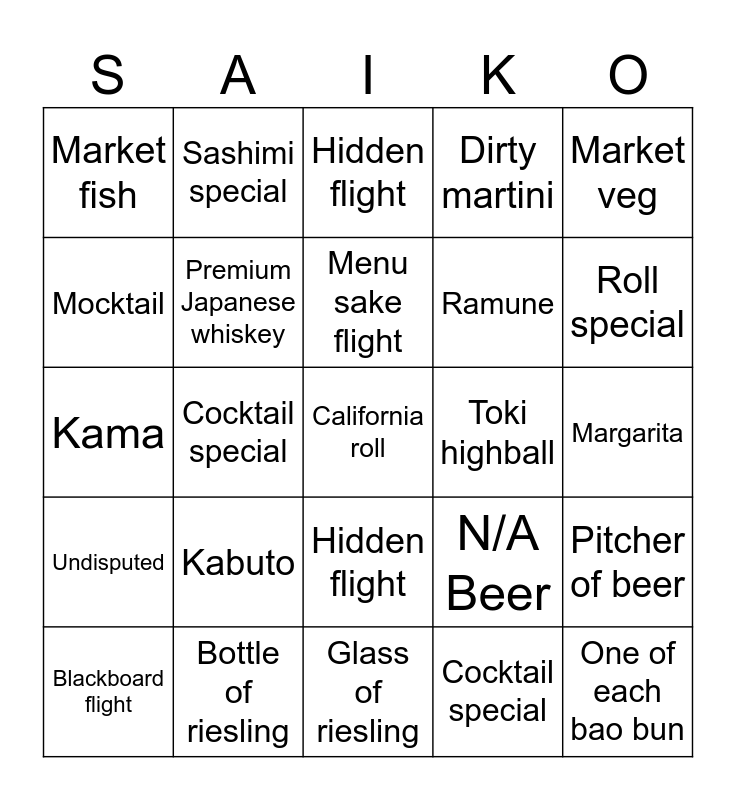 This bingo card has a free space and 24 words: Kabuto, Bottle of riesling, Menu sake flight, Blackboard flight, Market veg, Market fish, Mocktail, Sashimi special, Toki highball, Hidden flight, Ramune, Kama, N/A Beer, Pitcher of beer, Premium Japanese whiskey, Cocktail special, Margarita, Hidden flight, Roll special, Cocktail special, One of each bao bun, Undisputed, Dirty martini and Glass of riesling.