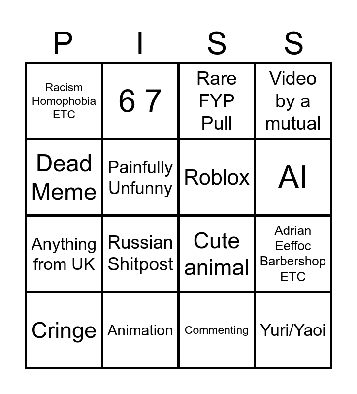 This bingo card has 19 words: Cute animal, OSC, Rare FYP Pull, Yuri/Yaoi, Adrian Eeffoc Barbershop ETC, Dead Meme, Commenting, Racism Homophobia ETC, 6 7, Anything from UK, Russian Shitpost, Painfully Unfunny, Roblox, Animation, Cringe, Wild Comments, Video by a mutual, AI and Vocaloid.