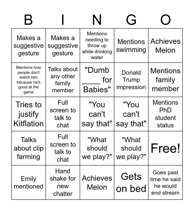 This bingo card has 49 words: "Dumb ____ for Babies", "You can't say that", Wears the Bag, Achieves Melon, Full screen to talk to chat, Gets on his bed, Makes a suggestive gesture, Donald Trump impression, Mentions how people don't watch him because he's good at the game, Talks about Fiancee, Talks about any other family member, Mentions swimming, Free!, "What should we play?", Talks about clip farming, "I need to edit clips", "Dumb ____ for Babies", "You can't say that", Wears Bag, Achieves Melon, Full screen to talk to chat, Gets on bed, Makes a suggestive gesture, Donald Trump impression, "people don't watch me because I'm good at the game", Mentions family member, Emily mentioned, Mentions swimming, "What should we play?", Talks about clip farming, "I need to edit clips", "Stop it", Tells embarrassing story from past, Says something suggestive, Hand shake for new chatter, Mentions Gamba, "That's craaazzyy", Chair stream / leaves room, Mentions PhD student status, "I work in a chemistry lab", Scolds chat, Forgets to swap back to the correct screen/camera while gaming, Goes past time he said he would end stream, Tony show mentioned, Tries to justify Kitflation, Mentions needing to throw up while drinking water, Executed pre-planned bit, Eats glue and Asks chat to type "Chug".