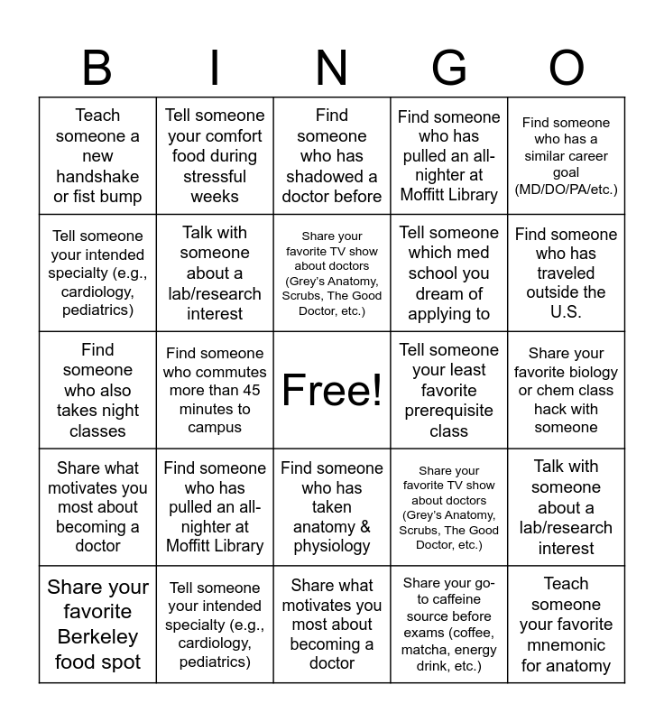 This bingo card has a free space and 70 words: Find someone who transferred from the same community college as you, Share your favorite biology or chem class hack with someone, Exchange study tips for the MCAT, Take a selfie with someone and show it to the group, Tell someone your intended specialty (e.g., cardiology, pediatrics), Find a person who has done clinical volunteering, Find someone who has pulled an all-nighter at Moffitt Library, Teach someone your favorite mnemonic for anatomy, Find someone who has a similar career goal (MD/DO/PA/etc.), Share your best study spot on campus, Talk with someone about a lab/research interest, Share your favorite Berkeley food spot, Teach someone a new handshake or fist bump, Find someone who has shadowed a doctor before, Find someone who’s planning to take the MCAT in 2026/2027, Find someone who commutes more than 45 minutes to campus, Find someone who has taken anatomy & physiology, Tell someone which med school you dream of applying to, Find someone who likes organic chemistry (yes, they exist!), Share what motivates you most about becoming a doctor, Tell someone your least favorite prerequisite class, Share your favorite TV show about doctors (Grey’s Anatomy, Scrubs, The Good Doctor, etc.), Find someone who has traveled outside the U.S., Find someone who has been to a Cal football game, Share your most awkward Berkeley moment so far, Find someone who also takes night classes, Teach someone a new premed-related acronym (like SOAP, MCAT, etc.), Find someone who can recite the Krebs cycle (or part of it!), Share your go-to caffeine source before exams (coffee, matcha, energy drink, etc.), Find someone who also works a part-time job while at Berkeley, Tell someone your comfort food during stressful weeks, Find someone who has a pet (bonus if they show you a picture), Share your favorite quiet study spot outside the library, Find someone who’s interested in public health or global health, Tell someone a weird or funny fact about the human body, Find someone who transferred from the same community college as you, Share your favorite biology or chem class hack with someone, Exchange study tips for the MCAT, Take a selfie with someone and show it to the group, Tell someone your intended specialty (e.g., cardiology, pediatrics), Find a person who has done clinical volunteering, Find someone who has pulled an all-nighter at Moffitt Library, Teach someone your favorite mnemonic for anatomy, Find someone who has a similar career goal (MD/DO/PA/etc.), Share your best study spot on campus, Talk with someone about a lab/research interest, Share your favorite Berkeley food spot, Teach someone a new handshake or fist bump, Find someone who has shadowed a doctor before, Find someone who’s planning to take the MCAT in 2026/2027, Find someone who commutes more than 45 minutes to campus, Find someone who has taken anatomy & physiology, Tell someone which med school you dream of applying to, Find someone who likes organic chemistry (yes, they exist!), Share what motivates you most about becoming a doctor, Tell someone your least favorite prerequisite class, Share your favorite TV show about doctors (Grey’s Anatomy, Scrubs, The Good Doctor, etc.), Find someone who has traveled outside the U.S., Find someone who has been to a Cal football game, Share your most awkward Berkeley moment so far, Find someone who also takes night classes, Teach someone a new premed-related acronym (like SOAP, MCAT, etc.), Find someone who can recite the Krebs cycle (or part of it!), Share your go-to caffeine source before exams (coffee, matcha, energy drink, etc.), Find someone who also works a part-time job while at Berkeley, Tell someone your comfort food during stressful weeks, Find someone who has a pet (bonus if they show you a picture), Share your favorite quiet study spot outside the library, Find someone who’s interested in public health or global health and Tell someone a weird or funny fact about the human body.
