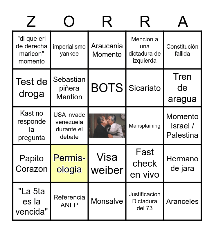 This bingo card has a free space and 24 words: Permis- ologia, Referencia ANFP, BOTS, "La 5ta es la vencida", Constitución fallida, "di que eri de derecha maricon" momento, Test de droga, imperialismo yankee, Mansplaining, Visa weiber, Sicariato, Kast no responde la pregunta, Fast check en vivo, Hermano de jara, Sebastian piñera Mention, Justificacion Dictadura del 73, Momento Israel / Palestina, Araucania Momento, Tren de aragua, USA invade venezuela durante el debate, Aranceles, Papito Corazon, Mencion a una dictadura de izquierda and Monsalve.