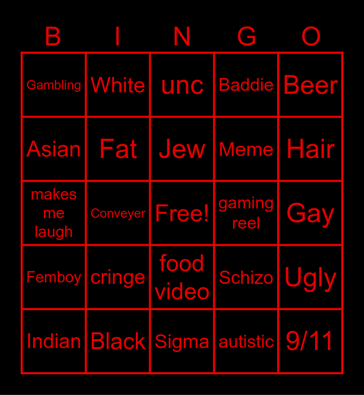 This bingo card has a free space and 24 words: cringe, Black, Jew, Indian, Beer, Gambling, Asian, White, gaming reel, food video, Meme, makes me laugh, Schizo, Ugly, Fat, autistic, Gay, unc, Hair, Conveyer, 9/11, Femboy, Baddie and Sigma.
