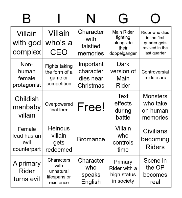 This bingo card has a free space and 24 words: Heinous villain gets redeemed, Characters with unnatural lifespans or existence, Important character dies near Christmas, A primary Rider turns evil, Rider who dies in the first quarter gets revived in the last quarter, Villain with god complex, Non-human female protagonist, Villain who's a CEO, Text effects during battle, Bromance, Dark version of Main Rider, Childish manbaby villain, Villain who controls time, Civilians becoming Riders, Fights taking the form of a game or competition, Primary Rider with a high status in society, Monsters who take on human memories, Character with falsfied memories, Controversial middle arc, Overpowered final form, Scene in the OP becomes real, Female lead has an evil counterpart, Main Rider fighting alongside their doppelganger and Character who speaks English.