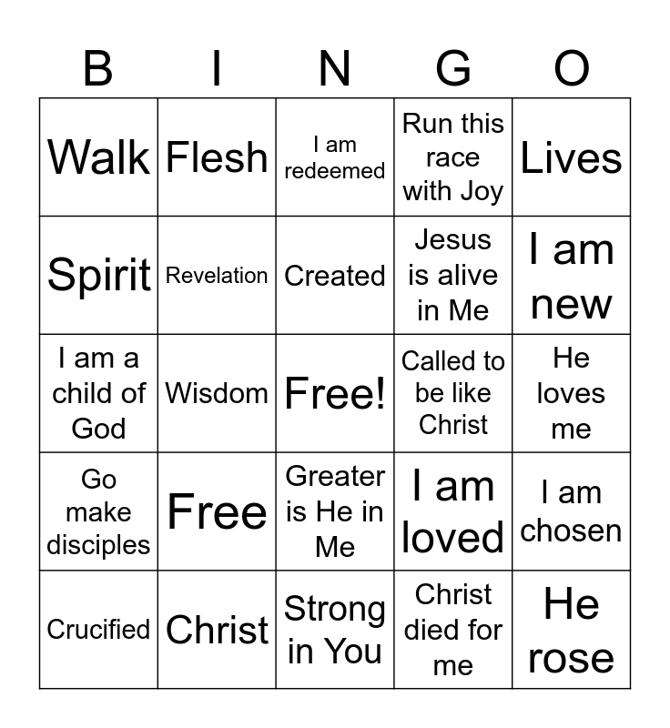 This bingo card has a free space and 24 words: Free, Christ, Created, Crucified, Lives, Walk, Spirit, Flesh, Called to be like Christ, Greater is He in Me, Jesus is alive in Me, I am a child of God, I am loved, I am chosen, Revelation, Christ died for me, He loves me, I am redeemed, I am new, Wisdom, He rose, Go make disciples, Run this race with Joy and Strong in You.