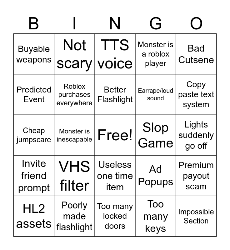 This bingo card has a free space and 52 words: Le long hallway, Impossible Section, Misspelled text, Too many locked doors, VHS filter, Paid promotion at start, Not scary, Boring Atmosphere, Predicted Event, Unecessary steps, Roblox purchases everywhere, Game breaks, Premium payout scam, Ad Popups, Retroslop, Accidentally click on roblox purchase, Better Flashlight, Slop Game, Stock sound effect, Bad Cutsene, Monster is inescapable, Too many keys, Buyable weapons, Earrape/loud sound, Jumpscare all, Super Jumpscare all, Monster breaks, ___[HORROR] as title, Copy paste text system, Generic looking monster, Monster isn't scary, Monster is a roblox player, Not clear directions for progression, Coma or timeskip, Thing makes no sense, TTS voice, Poorly made flashlight, Walking simulator, Blank interior, Baby puzzle, Random vent section, Lights suddenly go off, Invite friend prompt, Add to favorites prompt, Useless one time item, Red stock blood text, Yellow paint for progression, Cheap jumpscare, Fetch quest, Come back to an area and something changes, HL2 assets and You tried sticker.