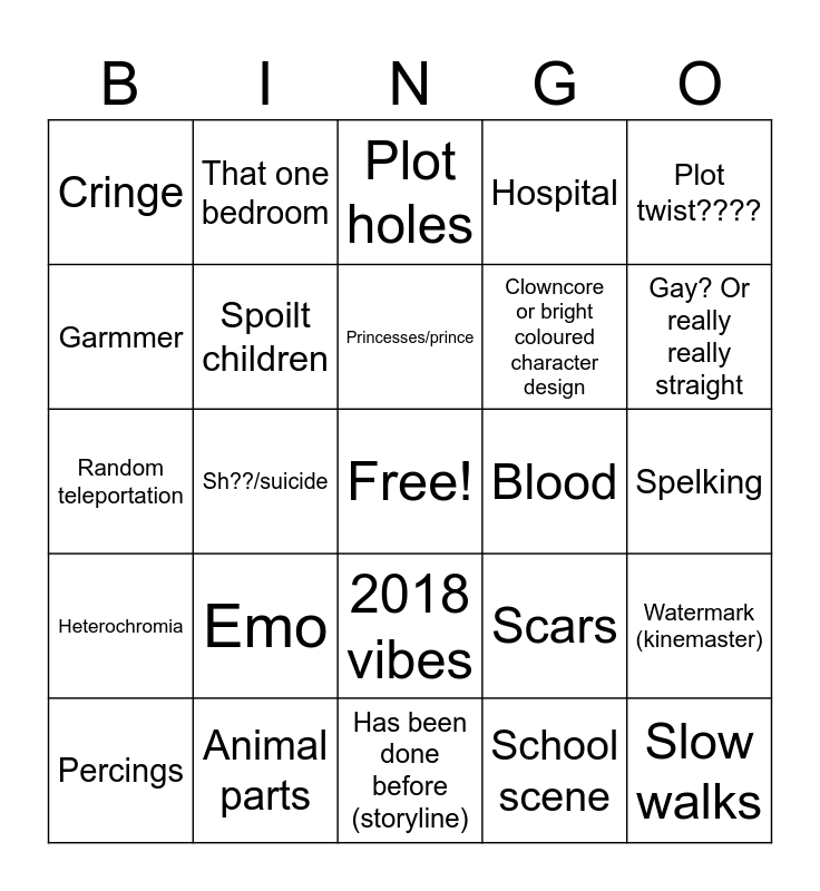 This bingo card has a free space and 24 words: Emo, Animal parts, Princesses/prince, Percings, Plot twist????, Cringe, Garmmer, That one bedroom, Blood, 2018 vibes, Clowncore or bright coloured character design, Random teleportation, Scars, Watermark (kinemaster), Spoilt children, School scene, Spelking, Plot holes, Gay? Or really really straight, Sh??/suicide, Slow walks, Heterochromia, Hospital and Has been done before (storyline).