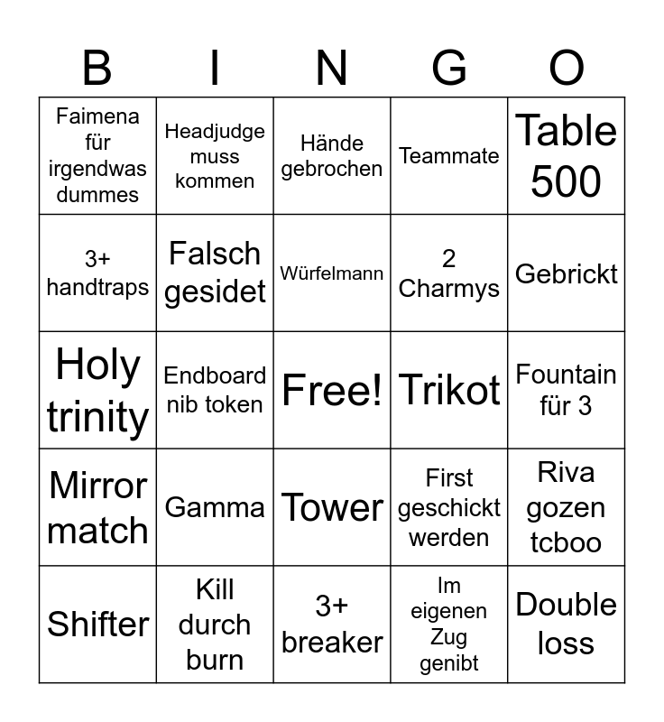 This bingo card has a free space and 24 words: Gamma, Kill durch burn, Würfelmann, Shifter, Table 500, Faimena für irgendwas dummes, 3+ handtraps, Headjudge muss kommen, Trikot, Tower, 2 Charmys, Holy trinity, First geschickt werden, Riva gozen tcboo, Falsch gesidet, Im eigenen Zug genibt, Fountain für 3, Hände gebrochen, Gebrickt, Endboard nib token, Double loss, Mirror match, Teammate and 3+ breaker.