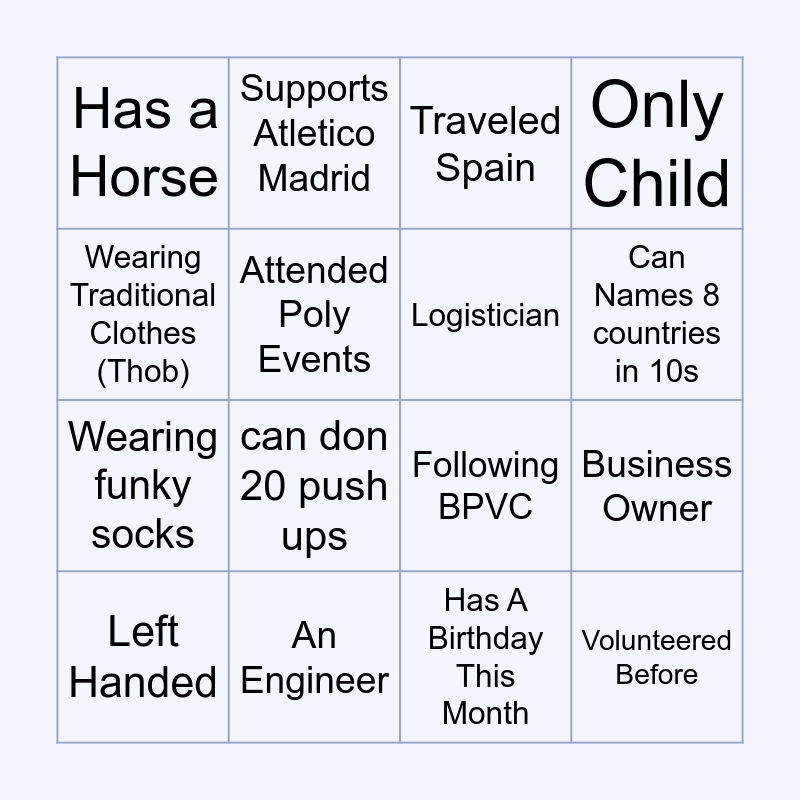 This bingo card has 16 words: Left Handed, An Engineer, Traveled Spain, Only Child, Wearing Traditional Clothes (Thob), Supports Atletico Madrid, Following BPVC, Business Owner, Has a Horse, Attended Poly Events, Has A Birthday This Month, Can Names 8 countries in 10s, Wearing funky socks, can don 20 push ups, Logistician and Volunteered Before.