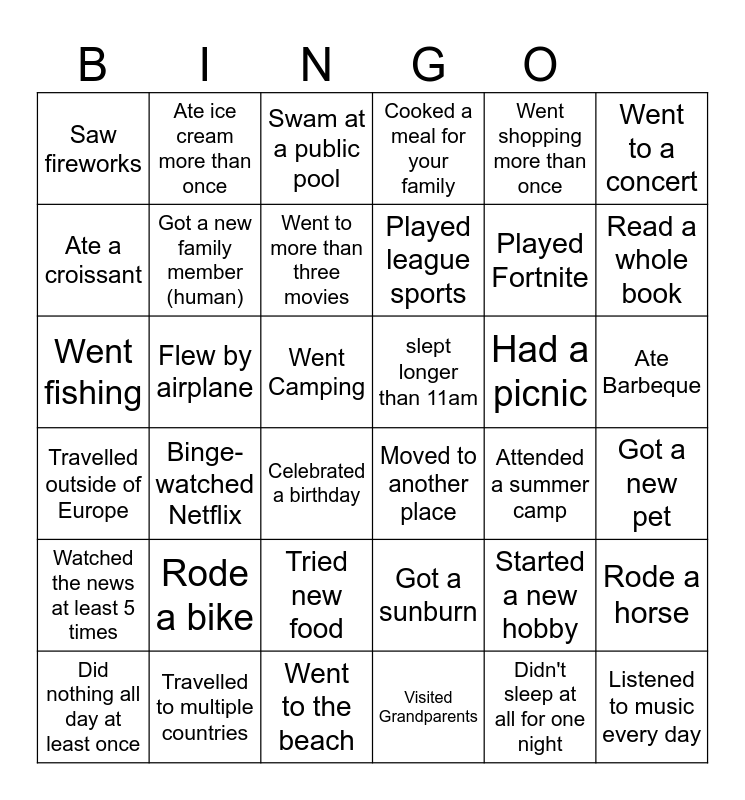 This bingo card has 36 words: Travelled outside of Europe, Binge-watched Netflix, Went to the beach, Played league sports, Had a picnic, Ate Barbeque, Saw fireworks, Travelled to multiple countries, Swam at a public pool, Got a sunburn, Played Fortnite, Went to a concert, Watched the news at least 5 times, Flew by airplane, Went to more than three movies, Cooked a meal for your family, Started a new hobby, Got a new pet, Ate a croissant, Got a new family member (human), Celebrated a birthday, Moved to another place, Attended a summer camp, Rode a horse, Went fishing, Ate ice cream more than once, Went Camping, Visited Grandparents, Went shopping more than once, Read a whole book, Did nothing all day at least once, Rode a bike, Tried new food, slept longer than 11am, Didn't sleep at all for one night and Listened to music every day.