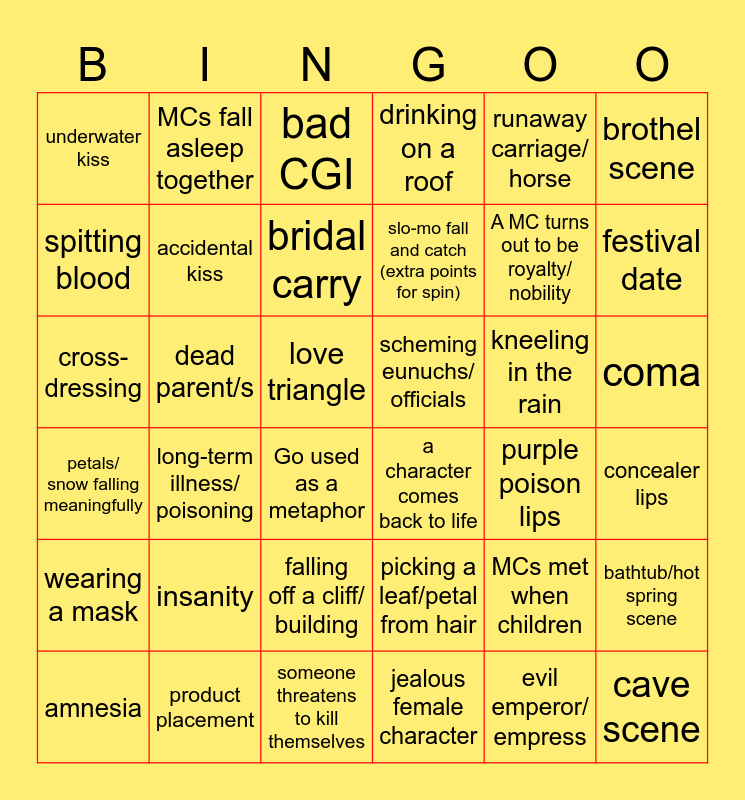 This bingo card has 36 words: petals/ snow falling meaningfully, long-term illness/ poisoning, someone threatens to kill themselves, slo-mo fall and catch (extra points for spin), kneeling in the rain, coma, underwater kiss, product placement, bad CGI, picking a leaf/petal from hair, A MC turns out to be royalty/ nobility, brothel scene, wearing a mask, dead parent/s, bridal carry, drinking on a roof, MCs met when children, concealer lips, spitting blood, accidental kiss, Go used as a metaphor, a character comes back to life, purple poison lips, bathtub/hot spring scene, cross-dressing, MCs fall asleep together, love triangle, jealous female character, runaway carriage/ horse, festival date, amnesia, insanity, falling off a cliff/ building, scheming eunuchs/ officials, evil emperor/ empress and cave scene.
