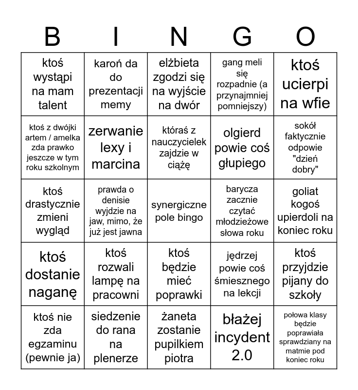 This bingo card has a free space and 24 words: ktoś rozwali lampę na pracowni, siedzenie do rana na plenerze, któraś z nauczycielek zajdzie w ciążę, ktoś nie zda egzaminu (pewnie ja), ktoś ucierpi na wfie, ktoś wystąpi na mam talent, ktoś z dwójki artem / amelka zda prawko jeszcze w tym roku szkolnym, karoń da do prezentacji memy, barycza zacznie czytać młodzieżowe słowa roku, ktoś będzie mieć poprawki, olgierd powie coś głupiego, ktoś drastycznie zmieni wygląd, jędrzej powie coś śmiesznego na lekcji, ktoś przyjdzie pijany do szkoły, zerwanie lexy i marcina, błażej incydent 2.0, goliat kogoś upierdoli na koniec roku, elżbieta zgodzi się na wyjście na dwór, sokół faktycznie odpowie "dzień dobry", prawda o denisie wyjdzie na jaw, mimo, że już jest jawna, połowa klasy będzie poprawiała sprawdziany na matmie pod koniec roku, ktoś dostanie naganę, gang meli się rozpadnie (a przynajmniej pomniejszy) and żaneta zostanie pupilkiem piotra.