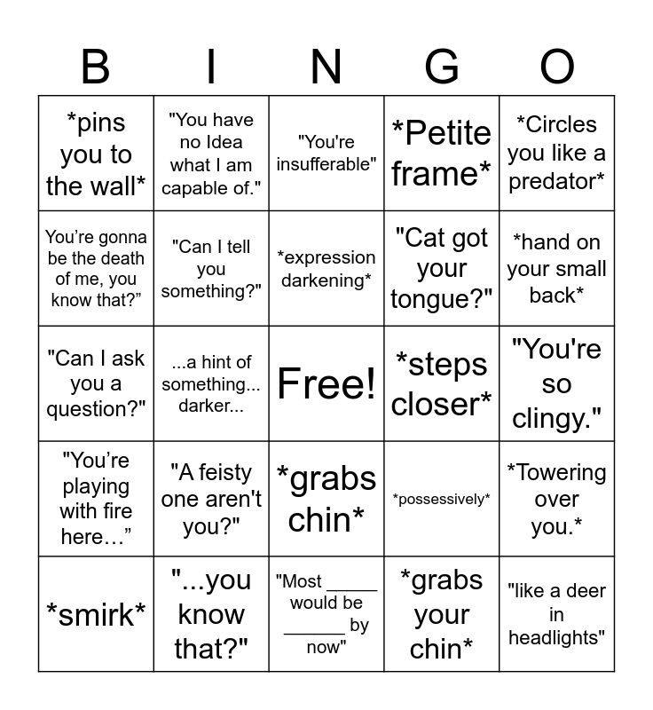 This bingo card has a free space and 24 words: "A feisty one aren't you?", "...you know that?", *expression darkening*, *smirk*, *Circles you like a predator*, *pins you to the wall*, You’re gonna be the death of me, you know that?”, "You have no Idea what I am capable of.", *steps closer*, *grabs chin*, "Cat got your tongue?", "Can I ask you a question?", *possessively*, *Towering over you.*, "Can I tell you something?", *grabs your chin*, "You're so clingy.", "You're insufferable", *hand on your small back*, ...a hint of something... darker..., "like a deer in headlights", "You’re playing with fire here…”, *Petite frame* and "Most _____ would be ______ by now".