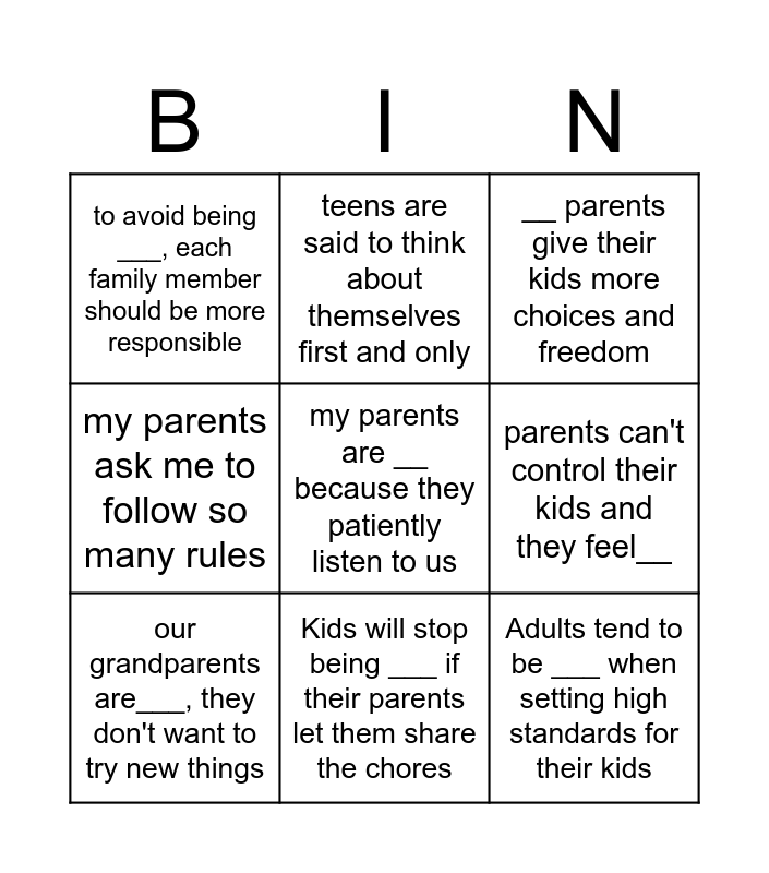 This bingo card has a free space and 8 words: my parents ask me to follow so many rules, teens are said to think about themselves first and only, parents can't control their kids and they feel__, our grandparents are___, they don't want to try new things, __ parents give their kids more choices and freedom, to avoid being ___, each family member should be more responsible, Kids will stop being ___ if their parents let them share the chores and Adults tend to be ___ when setting high standards for their kids.