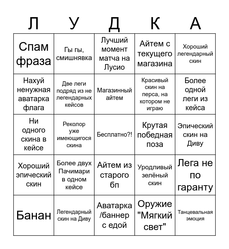 This bingo card has a free space and 24 words: Более двух Пачимари в одном кейсе, Легендарный скин на Диву, Магазинный айтем, Банан, Хороший легендарный скин, Спам фраза, Нахуй ненужная аватарка флага, Гы гы, смишнявка, Крутая победная поза, Айтем из старого бп, Красивый скин на перса, на котором не играю, Ни одного скина в кейсе, Уродливый зелёный скин, Лега не по гаранту, Две леги подряд из не легендарных кейсов, Оружие "Мягкий свет", Эпический скин на Диву, Лучший момент матча на Лусио, Более одной леги из кейса, Реколор уже имеющигося скина, Танцевальная эмоция, Хороший эпический скин, Айтем с текущего магазина and Аватарка /баннер с едой.