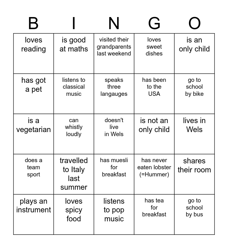 This bingo card has a free space and 24 words: travelled to Italy last summer, loves spicy food, speaks three langauges, plays an instrument, is an only child, loves reading, has got a pet, is good at maths, is not an only child, has muesli for breakfast, has been to the USA, is a vegetarian, has never eaten lobster (=Hummer), shares their room, listens to classical music, has tea for breakfast, lives in Wels, visited their grandparents last weekend, go to school by bike, can whistly loudly, go to school by bus, does a team sport, loves sweet dishes and listens to pop music.