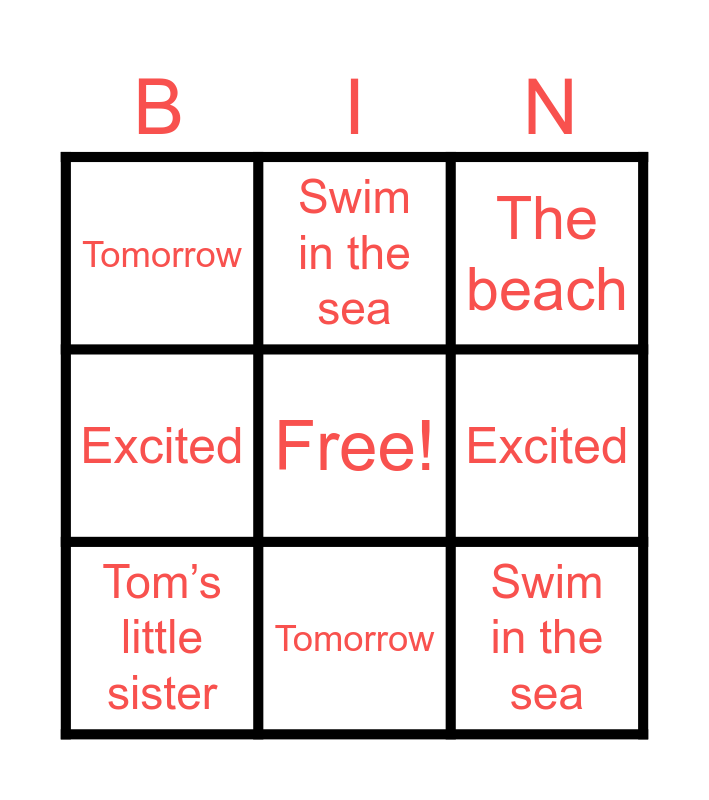This bingo card has a free space and 8 words: Excited, The beach, Swim in the sea, Tom’s little sister, Tomorrow, Swim in the sea, Excited and Tomorrow.