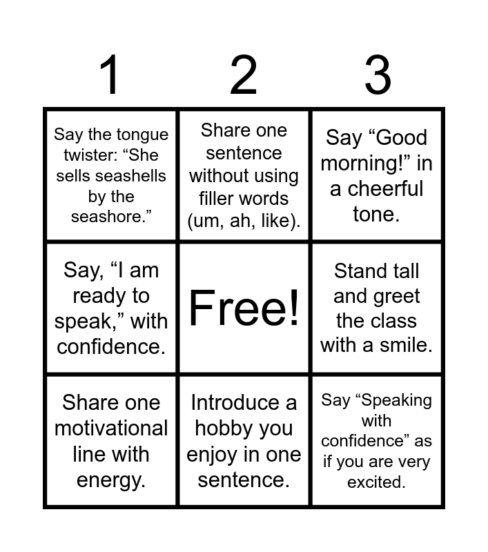 This bingo card has a free space and 20 words: Say your name in a whisper., Greet the class in a loud, energetic voice., Say “Good morning!” in a cheerful tone., Repeat the phrase “Education is power” with a rising pitch., Deliver a sentence slowly, with pauses., Say “Speaking with confidence” as if you are very excited., Introduce yourself in exactly 5 words., Say the tongue twister: “She sells seashells by the seashore.”, Pronounce clearly the word: Responsibility., Share one sentence without using filler words (um, ah, like)., Define confidence in one clear sentence., Use the word clarity in a short sentence., Stand tall and greet the class with a smile., Make eye contact with 3 classmates while saying, “I believe in myself.”, Share one motivational line with energy., Pretend you’re starting a lecture—say, “Welcome to our class!”, Introduce a hobby you enjoy in one sentence., Say, “I am ready to speak,” with confidence., Say “Teaching is fun” in a dramatic way (like acting). and Share your favorite food in one short sentence with enthusiasm..