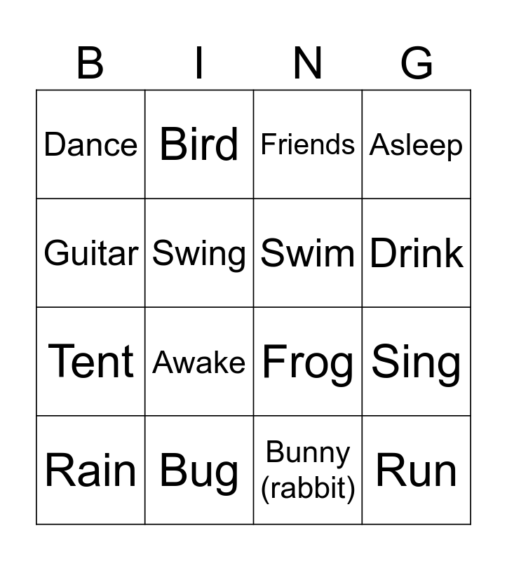 This bingo card has 16 words: Bug, Sing, Friends, Dance, Tent, Bird, Frog, Bunny (rabbit), Guitar, Swing, Rain, Asleep, Awake, Drink, Swim and Run.