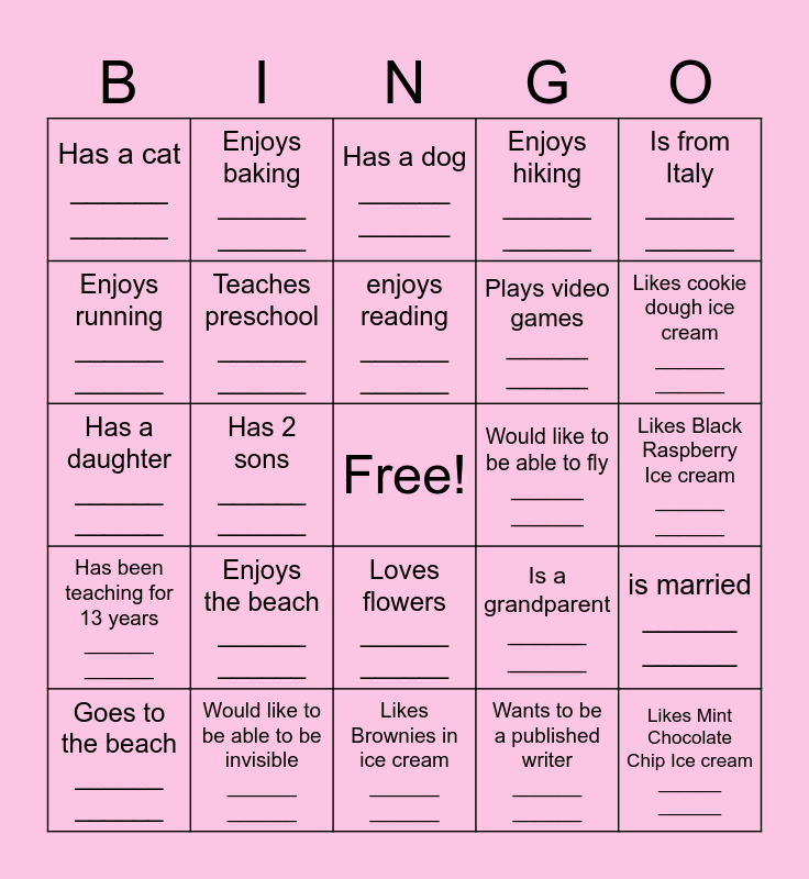 This bingo card has a free space and 29 words: Goes to the beach ______ ______, Enjoys snowboarding ______ ______, Has 2 sons ______ ______, Has gone camping ______ ______, Has a cat ______ ______, Has a dog ______ ______, Teaches preschool ______ ______, Enjoys the beach ______ ______, Would like to be able to fly ______ ______, Would like to be able to be invisible ______ ______, Likes Black Raspberry Ice cream ______ ______, Likes Mint Chocolate Chip Ice cream ______ ______, Likes Brownies in ice cream ______ ______, Wants to be a published writer ______ ______, Likes cookie dough ice cream ______ ______, Does schoolwork on the porch ______ ______, Loves flowers ______ ______, Has been teaching for 13 years ______ ______, Is from Italy ______ ______, Has a daughter ______ ______, Is a grandparent ______ ______, Has same first name as the Professor ______ ______, Plays video games ______ ______, Enjoys running ______ ______, Enjoys hiking ______ ______, Enjoys baking ______ ______, is married ______ ______, enjoys reading ______ ______ and likes strawberry ice cream ______ ______.