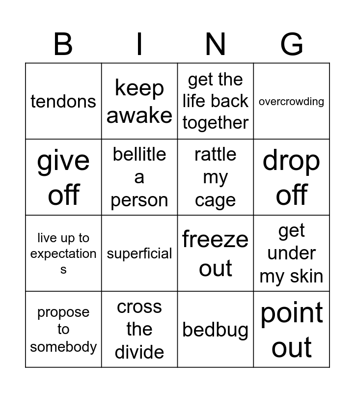 This bingo card has 17 words: bedbug, propose to somebody, get the life back together, tendons, superficial, overcrowding, get under my skin, rattle my cage, drop off, bellitle a person, cross the divide, freeze out, give off, keep awake, live up to expectation s, fall back on and point out.