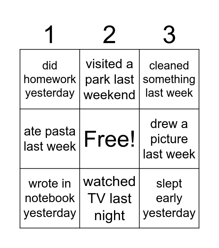 This bingo card has a free space and 24 words: ate rice yesterday, played soccer yesterday, watched TV last night, read a book yesterday, slept early yesterday, did homework yesterday, drew a picture last week, visited a park last weekend, sang a song yesterday, helped mom yesterday, drank milk last week, talked to friends last week, danced yesterday, went shopping last weekend, wrote in notebook yesterday, ate sushi last week, made something last week, cleaned something last week, watched a movie last week, played any game last week, walked to school last week, rode his/her bicycle last week, ate pasta last week and studied yesterday.