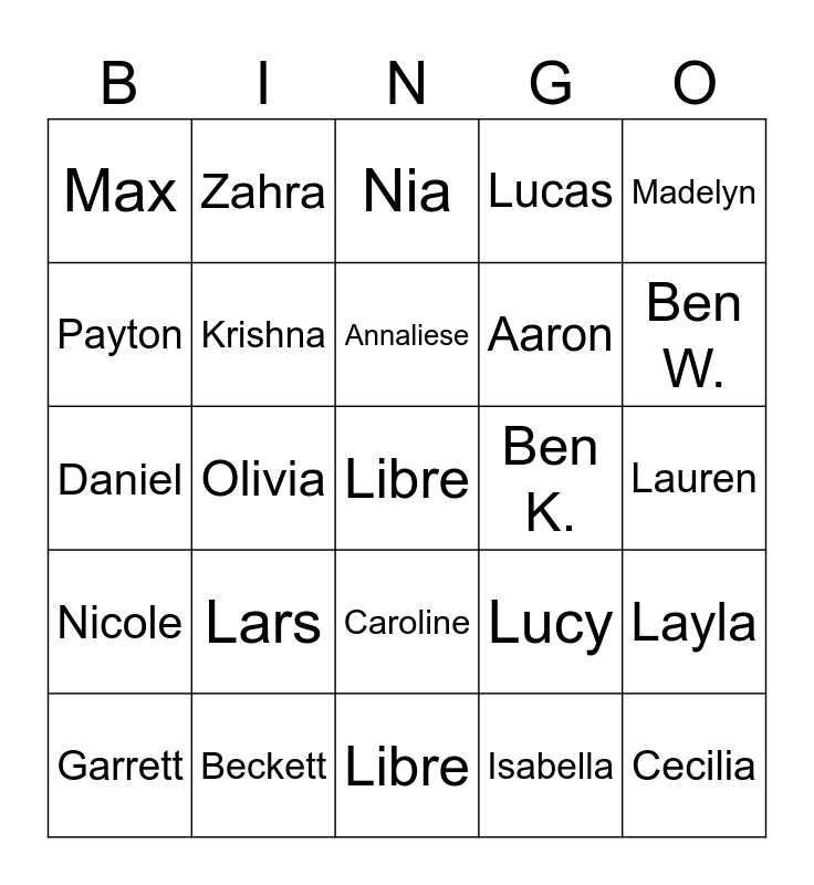 This bingo card has a free space and 24 words: Lars, Beckett, Annaliese, Garrett, Madelyn, Max, Payton, Zahra, Ben K., Caroline, Aaron, Daniel, Lucy, Layla, Krishna, Isabella, Lauren, Nia, Ben W., Olivia, Cecilia, Nicole, Lucas and Libre.