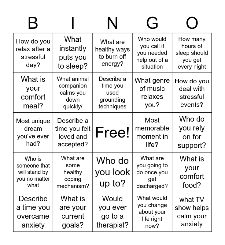 This bingo card has a free space and 24 words: What are some healthy coping mechanism?, What is are your current goals?, Describe a time you used grounding techniques, Describe a time you overcame anxiety, How many hours of sleep should you get every night, How do you relax after a stressful day?, What is your comfort meal?, What instantly puts you to sleep?, Most memorable moment in life?, Who do you look up to?, What genre of music relaxes you?, Most unique dream you've ever had?, What are you going to do once you get discharged?, What is your comfort food?, What animal companion calms you down quickly/, What would you change about your life right now?, Who do you rely on for support?, What are healthy ways to burn off energy?, How do you deal with stressful events?, Describe a time you felt loved and accepted?, what TV show helps calm your anxiety, Who is someone that will stand by you no matter what, Who would you call if you needed help out of a situation and Would you ever go to a therapist?.