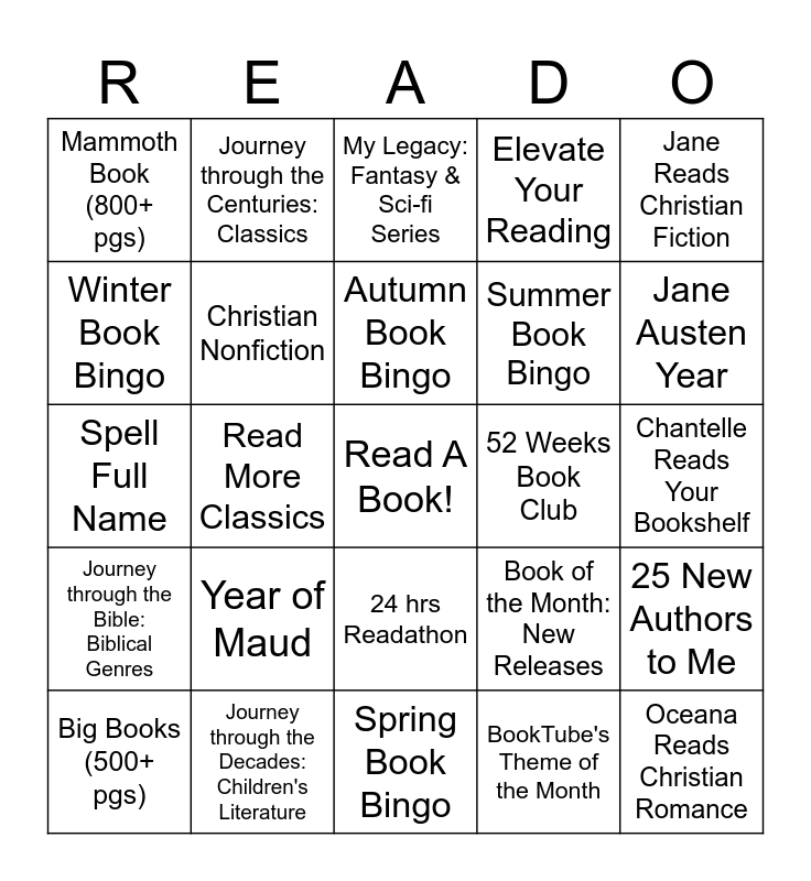 This bingo card has a free space and 24 words: Year of Maud, Journey through the Decades: Children's Literature, Autumn Book Bingo, Big Books (500+ pgs), Jane Reads Christian Fiction, Mammoth Book (800+ pgs), Winter Book Bingo, Journey through the Centuries: Classics, 52 Weeks Book Club, 24 hrs Readathon, Summer Book Bingo, Spell Full Name, Book of the Month: New Releases, 25 New Authors to Me, Christian Nonfiction, BookTube's Theme of the Month, Chantelle Reads Your Bookshelf, My Legacy: Fantasy & Sci-fi Series, Jane Austen Year, Read More Classics, Oceana Reads Christian Romance, Journey through the Bible: Biblical Genres, Elevate Your Reading and Spring Book Bingo.