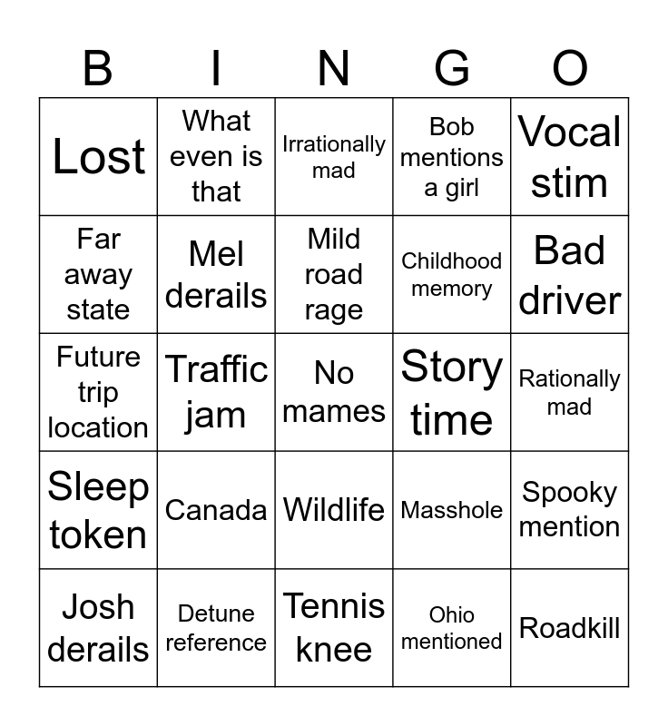 This bingo card has 25 words: Canada, Tennis knee, Mild road rage, Josh derails, Vocal stim, Lost, Far away state, What even is that, Story time, Wildlife, Childhood memory, Future trip location, Masshole, Spooky mention, Mel derails, Roadkill, Rationally mad, Irrationally mad, Bad driver, Traffic jam, No mames, Detune reference, Sleep token, Bob mentions a girl and Ohio mentioned.