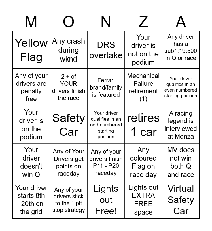 This bingo card has 29 words: Your driver starts 8th -20th on the grid, Any non car racing "celebrity" is spotted in the paddock, Safety Car, Virtual Safety Car, Yellow Flag, DRS overtake, 2 + of YOUR drivers finish the race, Any of Your Drivers get points on raceday, retires 1 car, Any of your drivers stick to the 1 pit stop strategy, A racing legend is interviewed at Monza, Your driver qualifies in an odd numbered starting position, Lights out Free!, Lights out EXTRA FREE space, Your driver qualifies in an even numbered starting position, Your driver wins Q, Any of your drivers finish P11 - P20 raceday, Your driver doesn't win Q, Any driver has a sub1:19:500 in Q or race, Your driver is on the podium, Any coloured Flag on race day, Any of your drivers don't win Fastest Lap, Mechanical Failure retirement (1), Any of your drivers are penalty free, Your driver is not on the podium, Any crash during wknd, MV does not win both Q and race, Ferrari brand/family is featured and Double podium by any team.