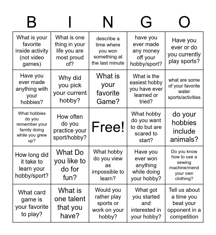 This bingo card has a free space and 24 words: What Do you like to do for fun?, What is one talent that you have?, What is your favorite Game?, What card game is your favorite to play?, Have you ever or do you currently play sports?, What is your favorite inside activity (not video games), Have you ever made anything with your hobbies?, What is one thing in your life you are most proud of?, What hobby do you want to do but are scared to start?, What hobby do you view as impossible to learn?, What is the easiest hobby you have ever learned or tried?, What hobbies do you remember your family doing while you grew up?, Have you ever won anything while doing your hobby?, Do you know how to use a sewing machine/mend your own clothing?, Why did you pick your current hobby?, What got you started and interested in your hobby?, do your hobbies include animals?, describe a time where you won something at the last minute, what are some of your favorite water sports/activities, How often do you practice your sport/hobby?, Tell us about a time you beat your opponent in a competition, How long did it take to learn your hobby/sport?, have you ever made any money off your hobby/sport? and Would you rather play sports or work on your hobby?.